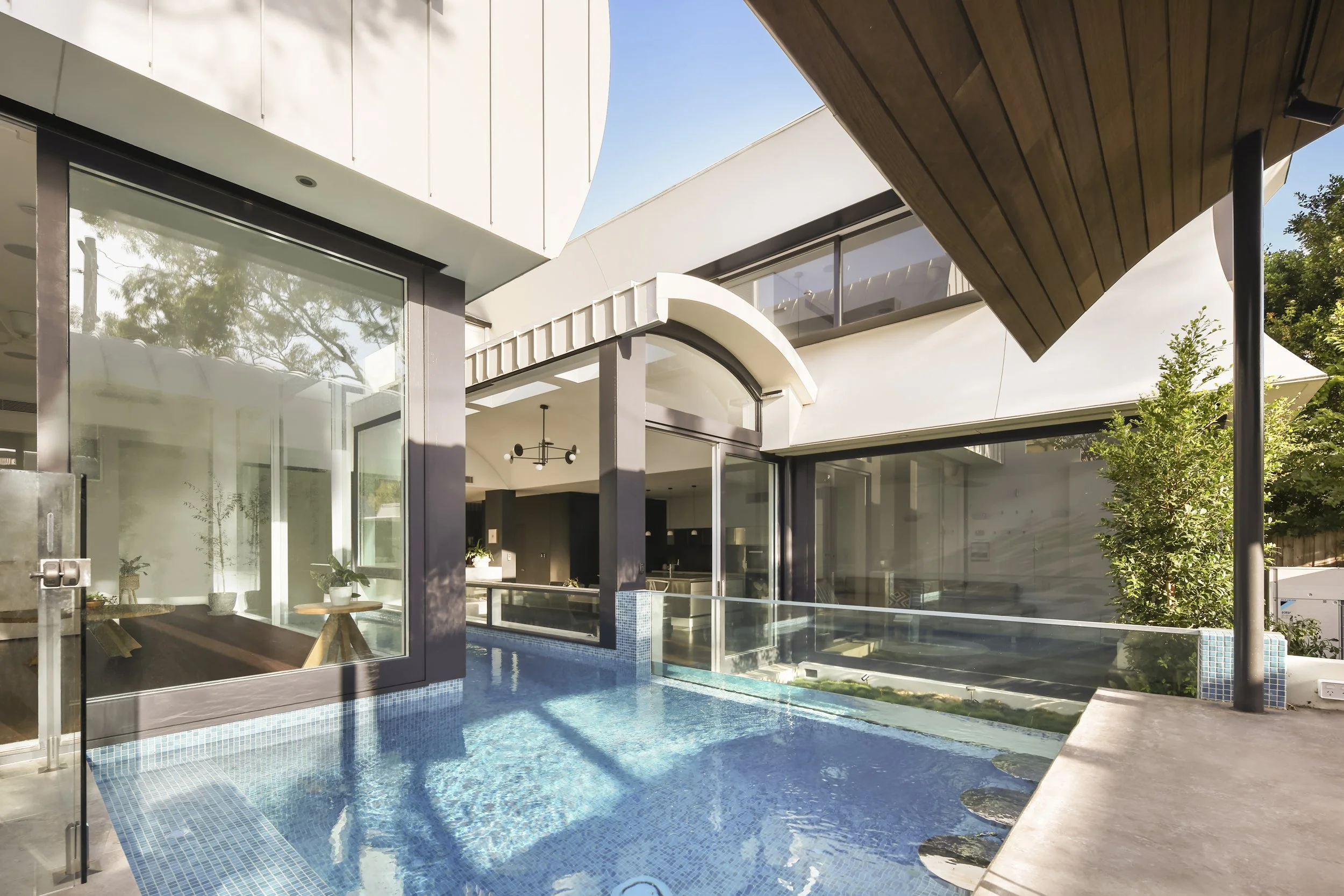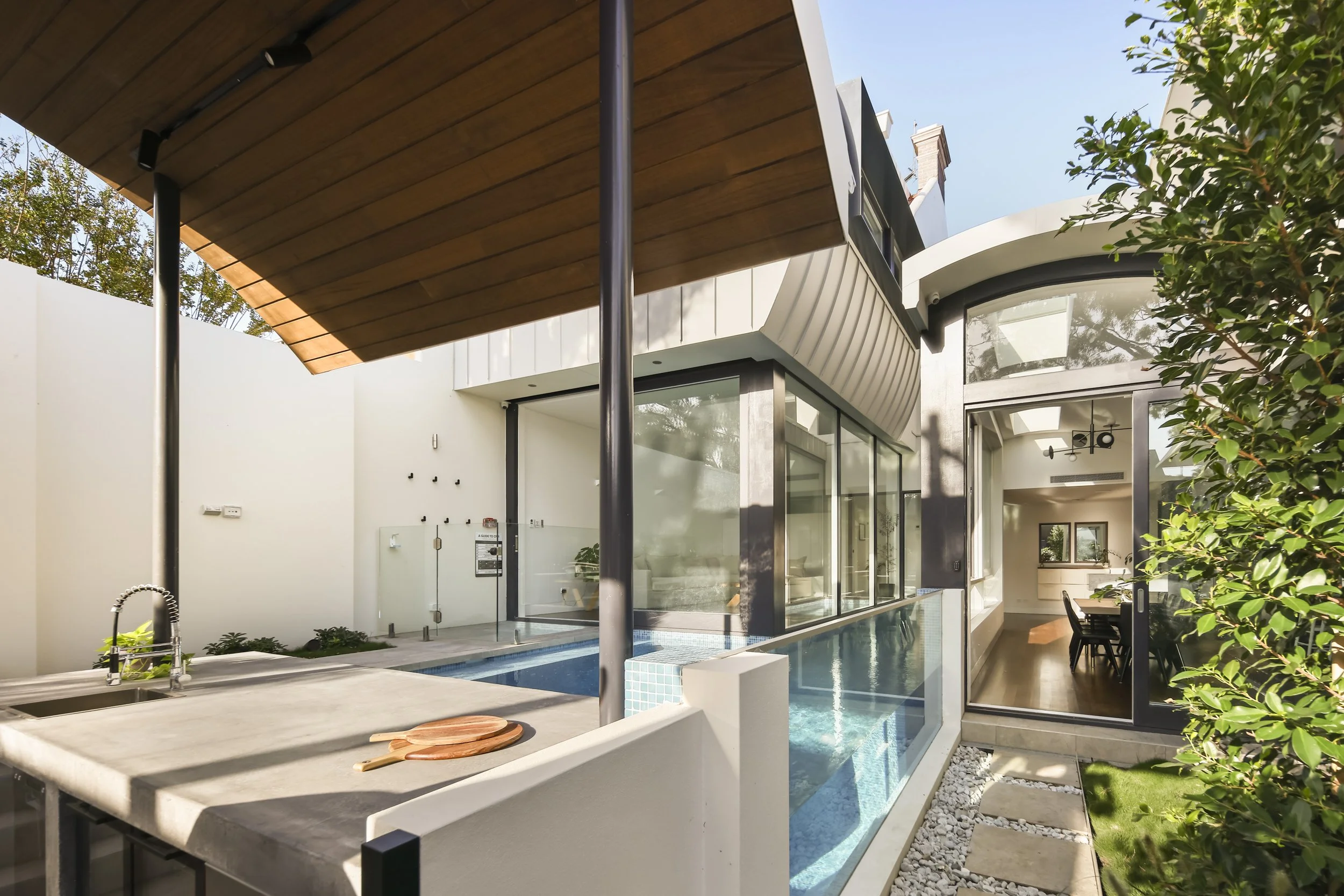 Union Street 2.0 continues the story of a previous Ambient project, seamlessly integrating new architectural layers with bold contemporary detailing. The design embraces contrast, in both concave and convex forms, while introducing curved standing-seam cladding, expansive sliding timber doors and windows, and finely crafted off-form concrete benchtops.